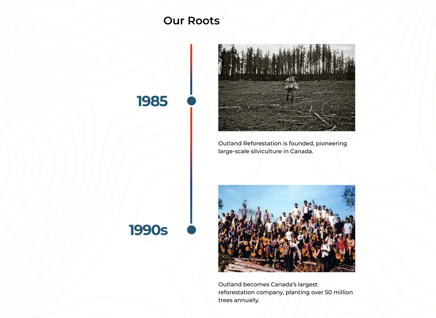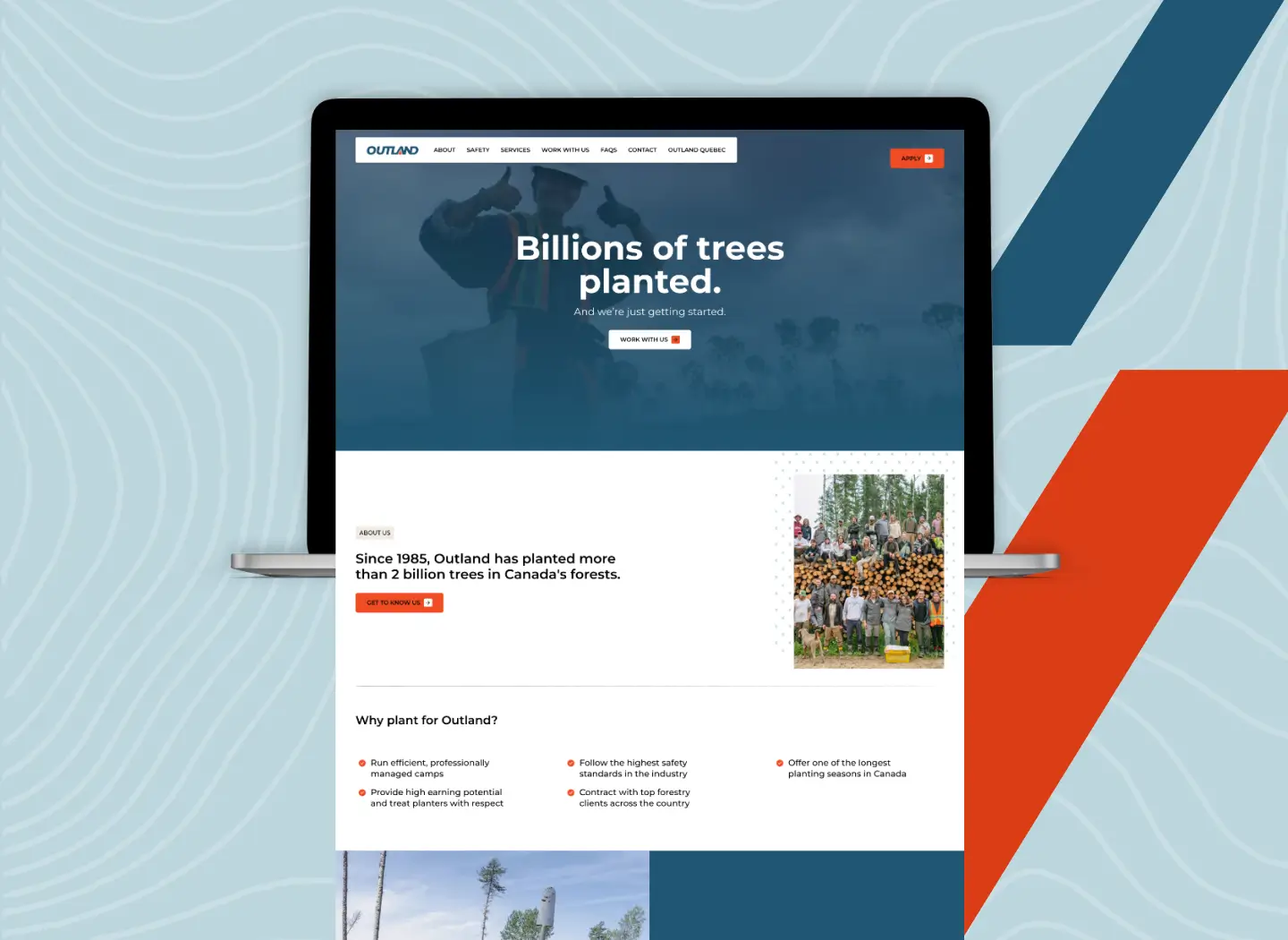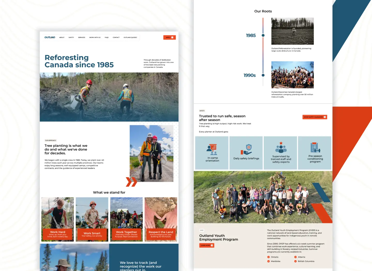 Outland is one of Canada's largest tree planting companies, but their website wasn't telling that story as well as it could. Built on WordPress, the old site was cluttered with dense text, lacked visual hierarchy, and made it hard for potential planters to find what they needed. Subpages scrolled long and read more like legal documents, with no real flow guiding users from learning about Outland to actually applying. Swank partnered with Outland to change that. We completely rebuilt their site from the ground up on Webflow, focusing heavily on clarity, storytelling, and intuitive conversion.