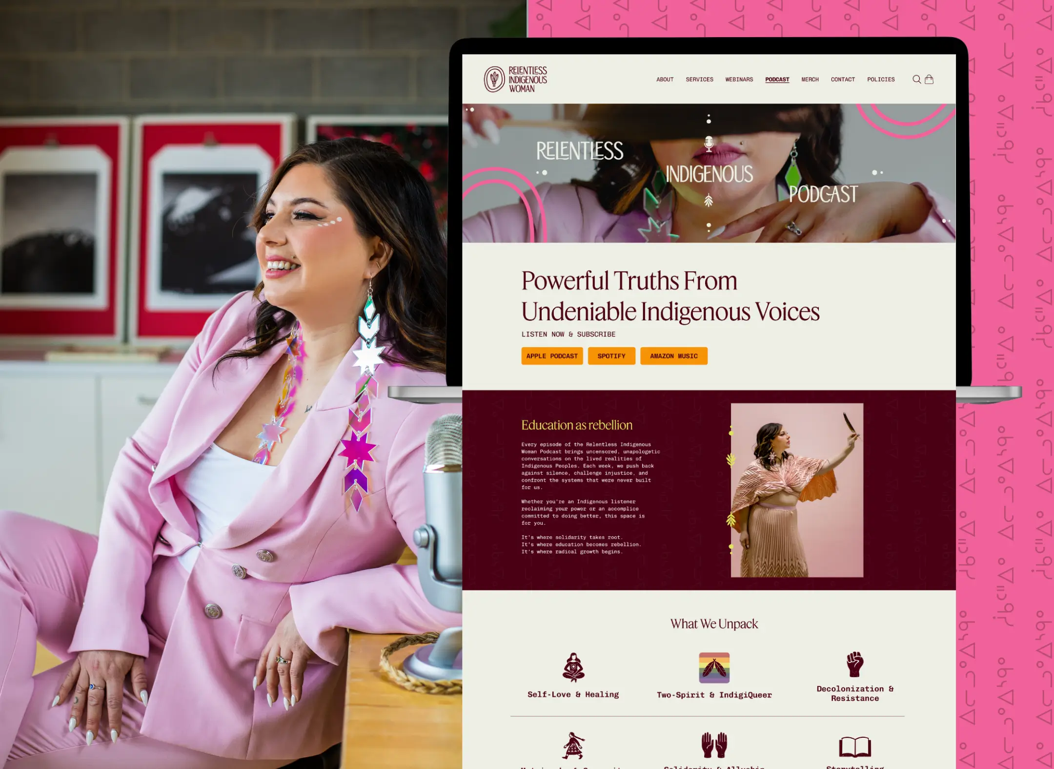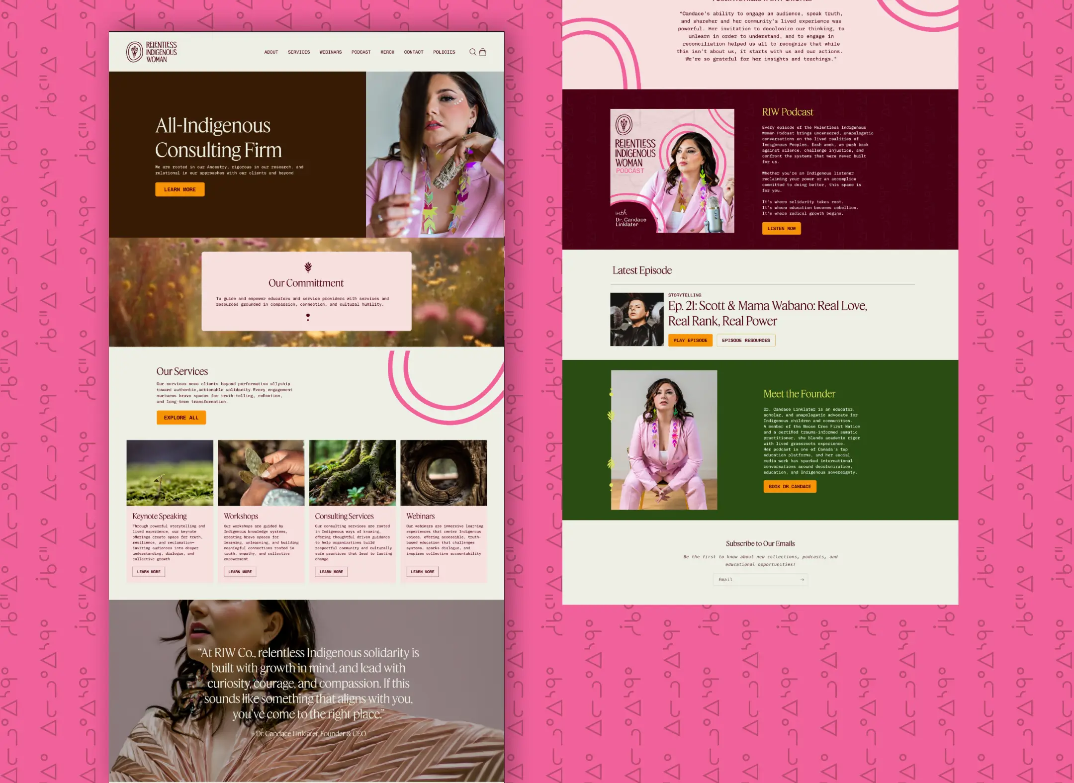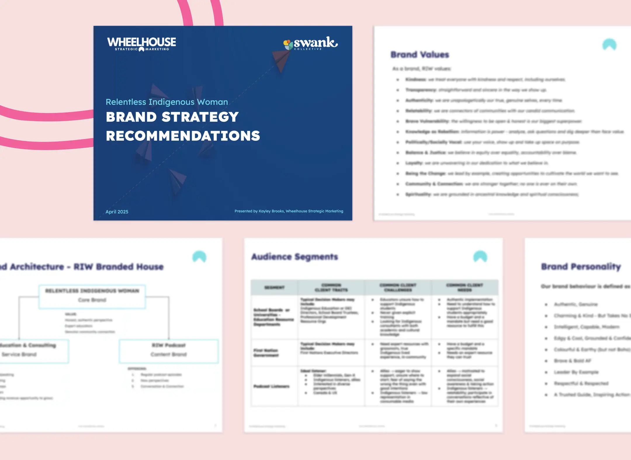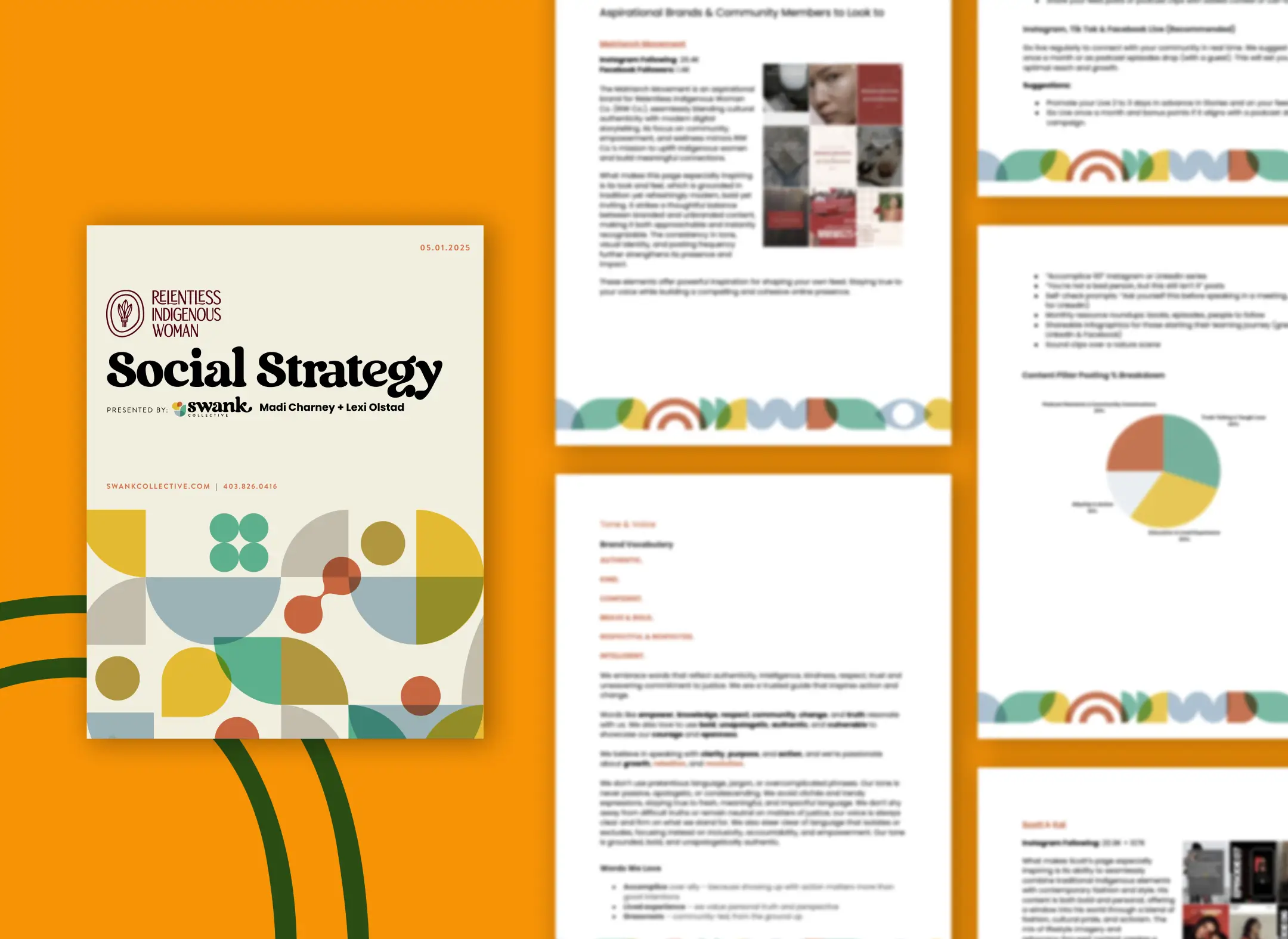 Dr. Candace Linklater, founder of Relentless Indigenous Woman (RIW), came to Swank with a powerful vision — to make learning cool. In addition to consulting and workshops, the brand also runs a podcast and needed a strong, cohesive identity to unite all its offerings. The project focused on three key goals: growing the podcast audience, booking more consulting projects, and positioning the brand as a leader in Indigenous education.